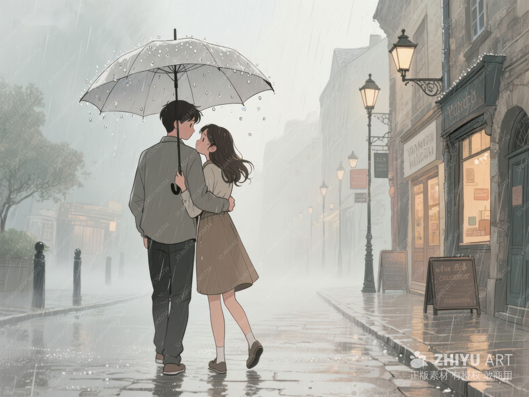 雨中情侣共撑伞,浪漫街头瞬间 1164