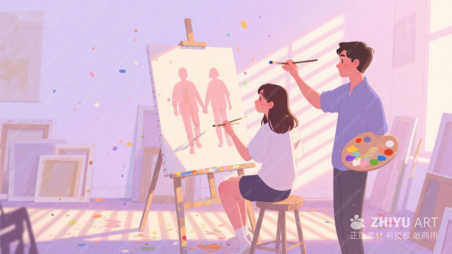 两人共同创作画作,室内温馨艺术氛围 461