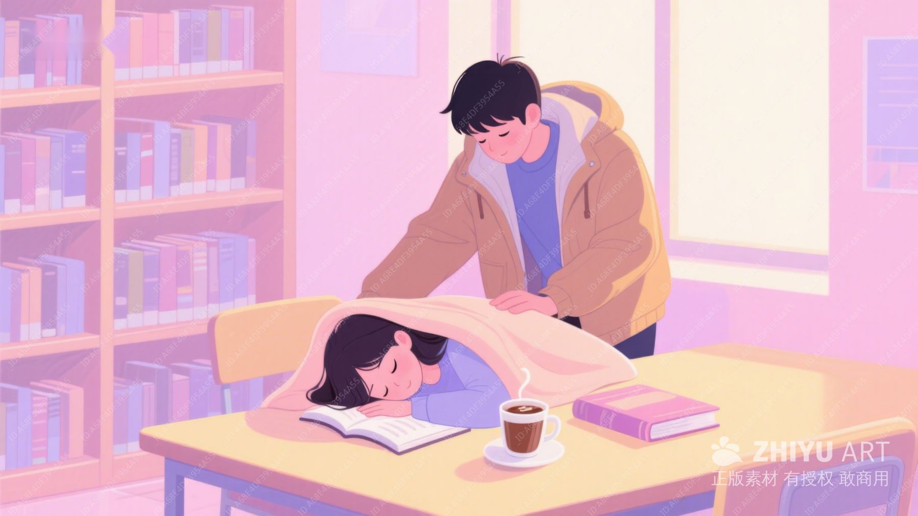 图书馆中男生为熟睡女生盖上外套 689