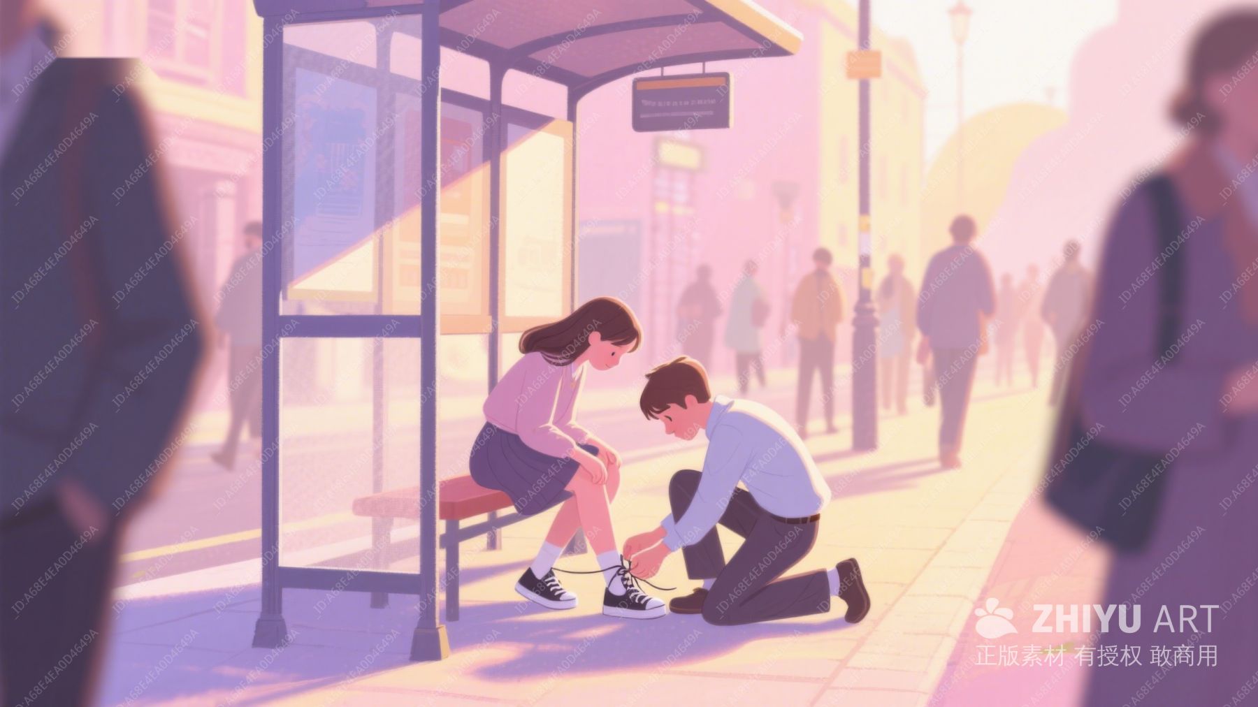 公交站旁,男子为女子系鞋带 203