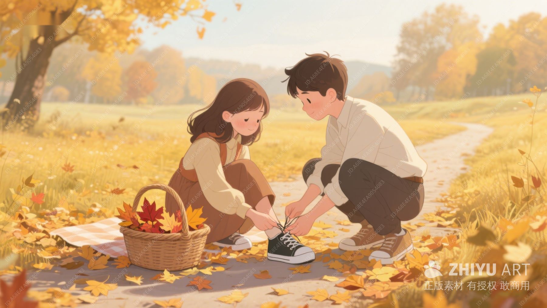 秋日漫步:情侣手牵手行走在落叶小径 594