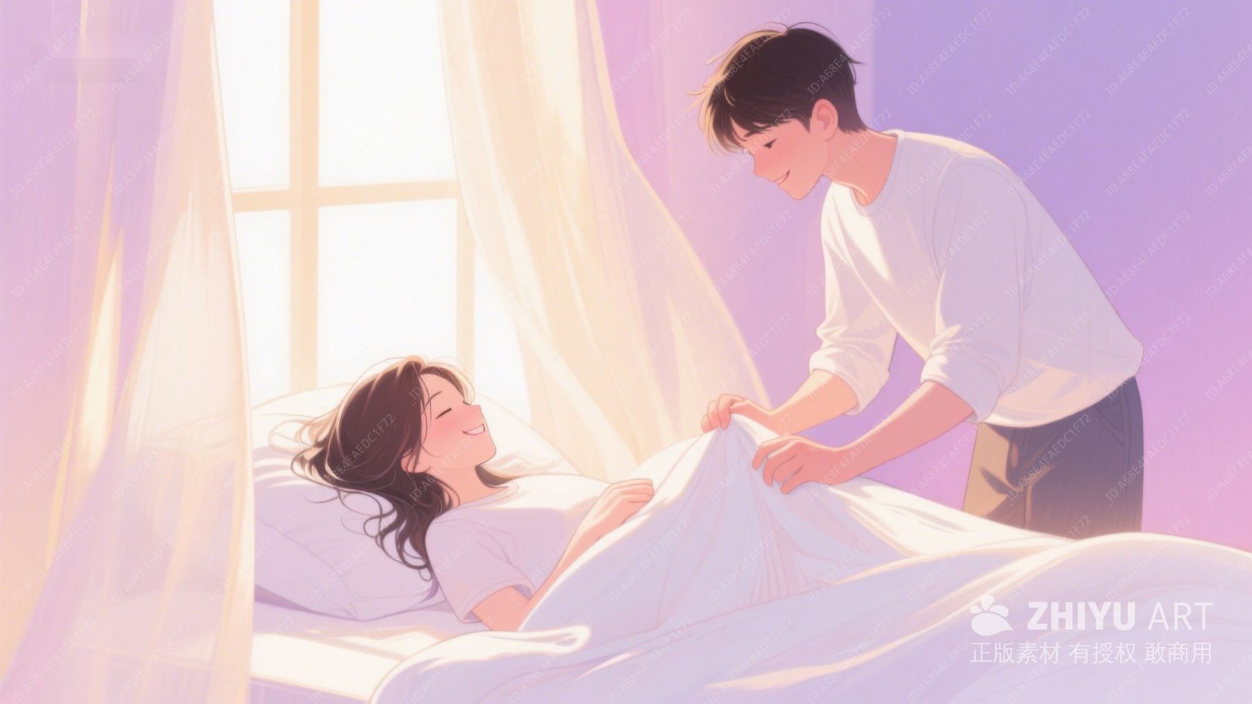 温馨晨光中,男子轻抚熟睡女子的被子 366