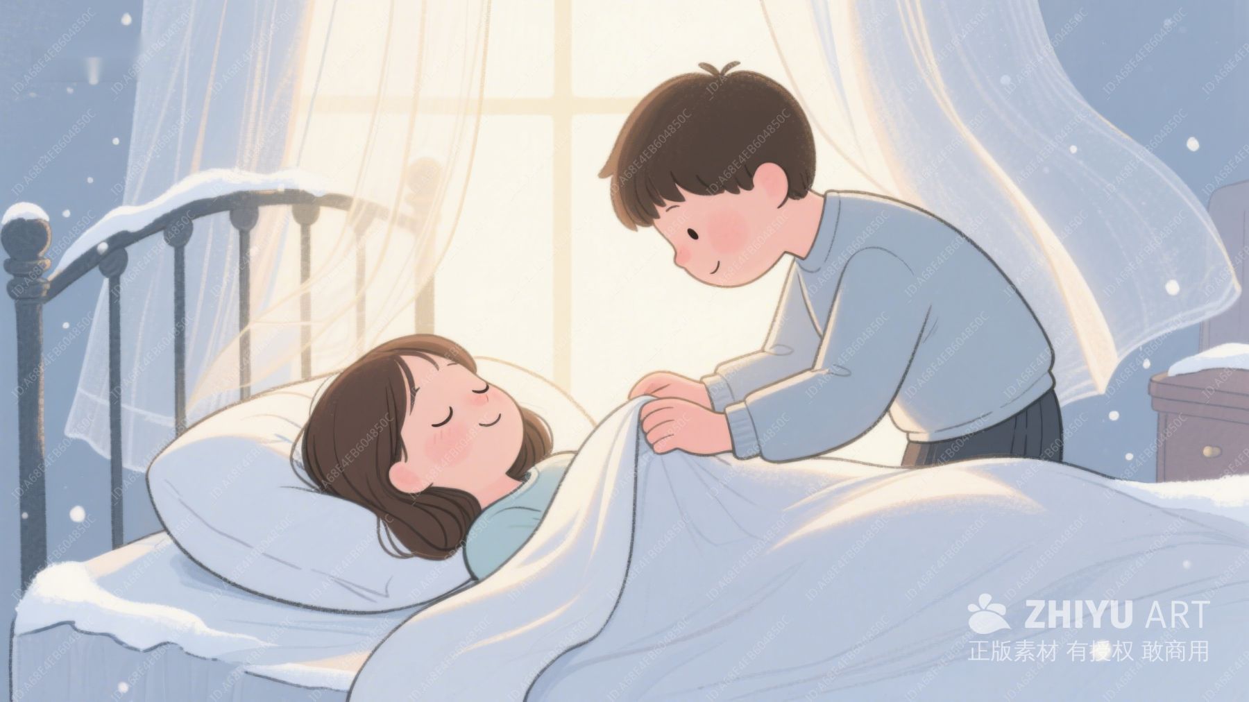 男孩轻柔为女孩盖被,温馨卧室场景 499