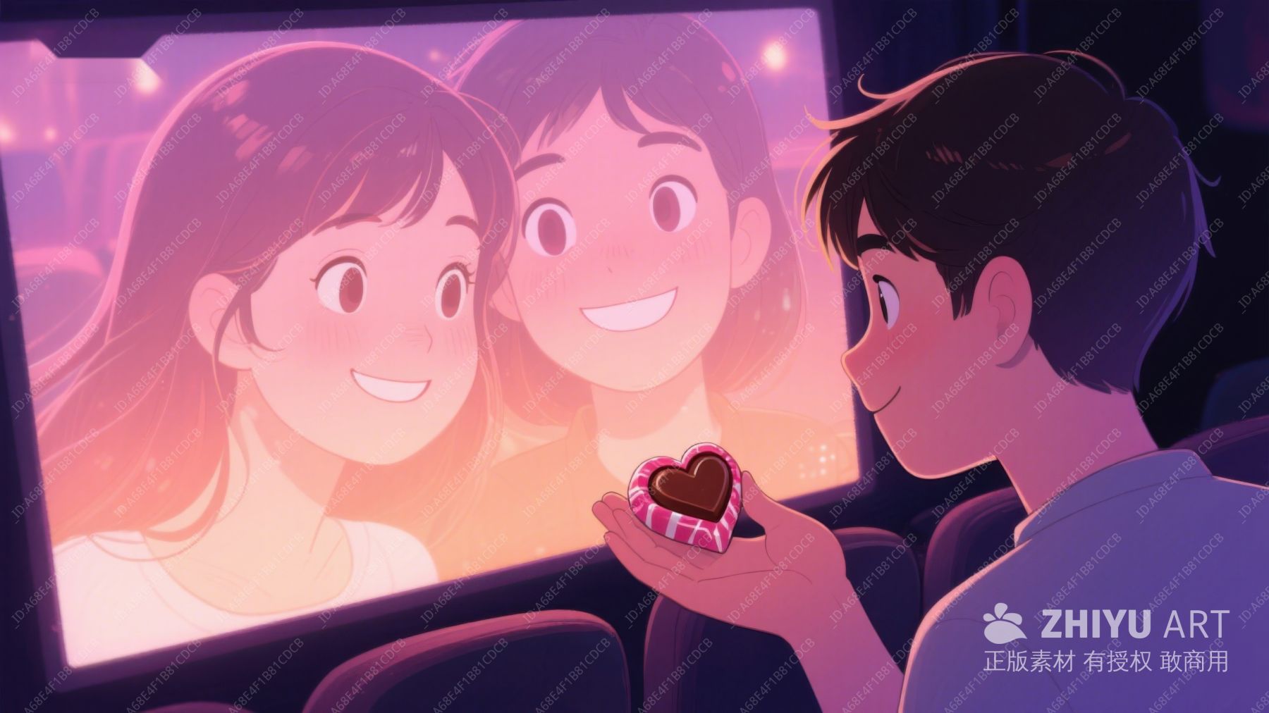 男孩手捧心形巧克力,注视屏幕上的双人笑脸 234