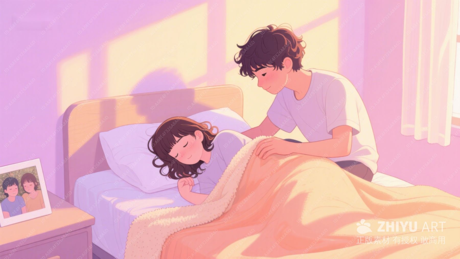 男孩轻抚女孩,温馨床边场景 233