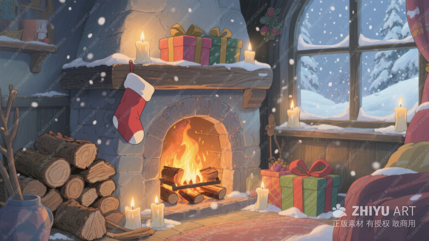 温馨圣诞夜,壁炉旁的礼物与烛光 285