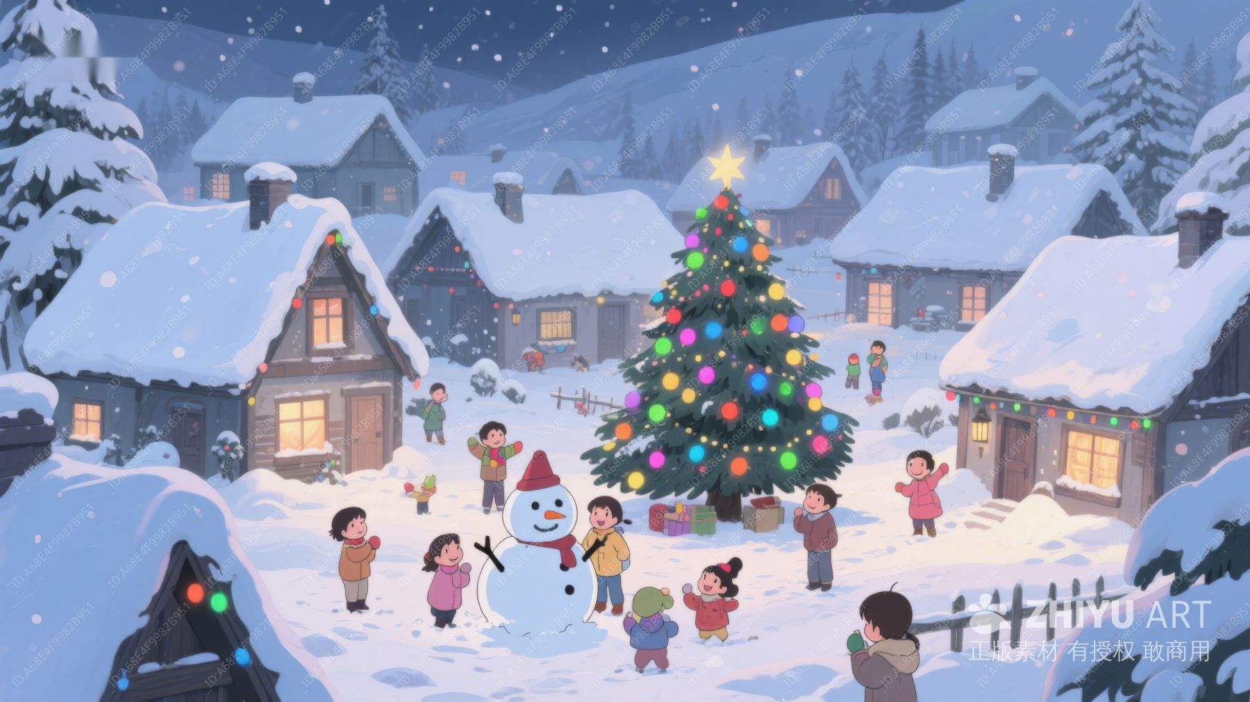雪夜村庄里的圣诞树与欢庆儿童 365