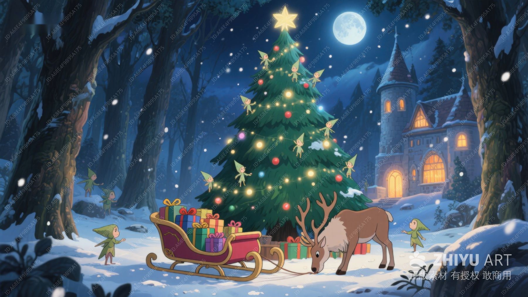 雪夜森林中的圣诞树与驯鹿雪橇 376