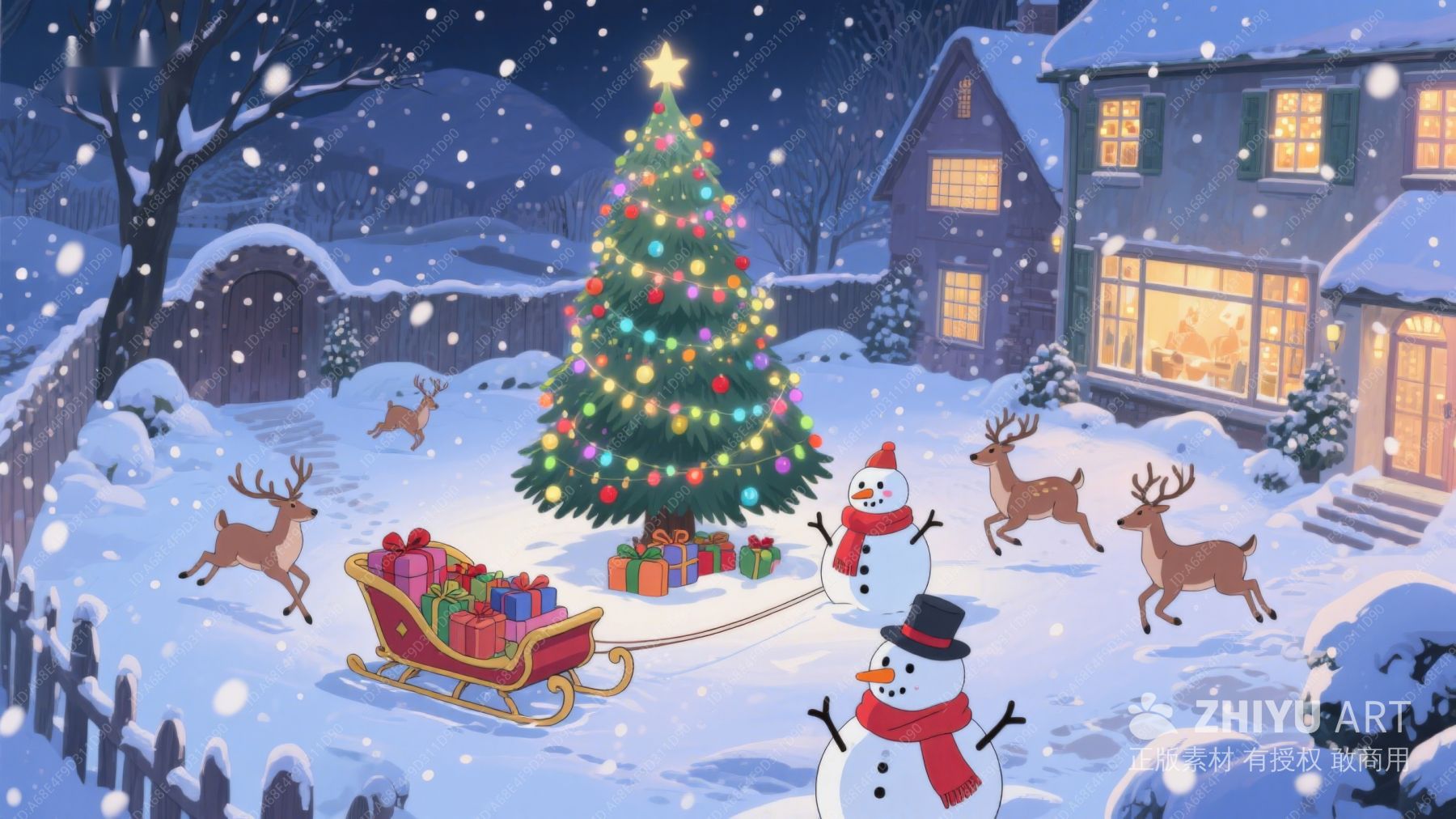 雪夜圣诞树与飞驰的驯鹿雪橇 408