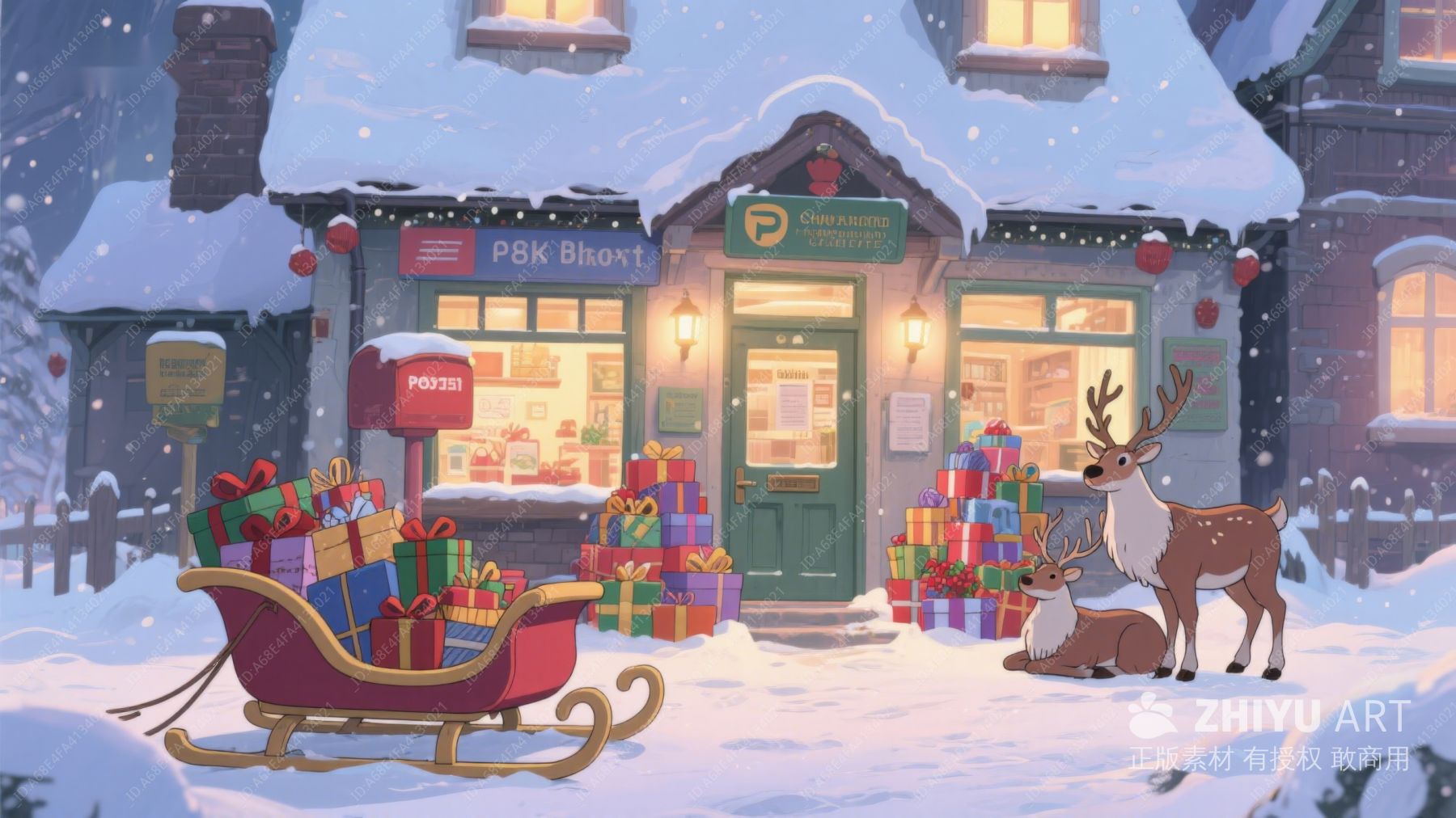 雪夜邮局前的圣诞礼物与驯鹿 484