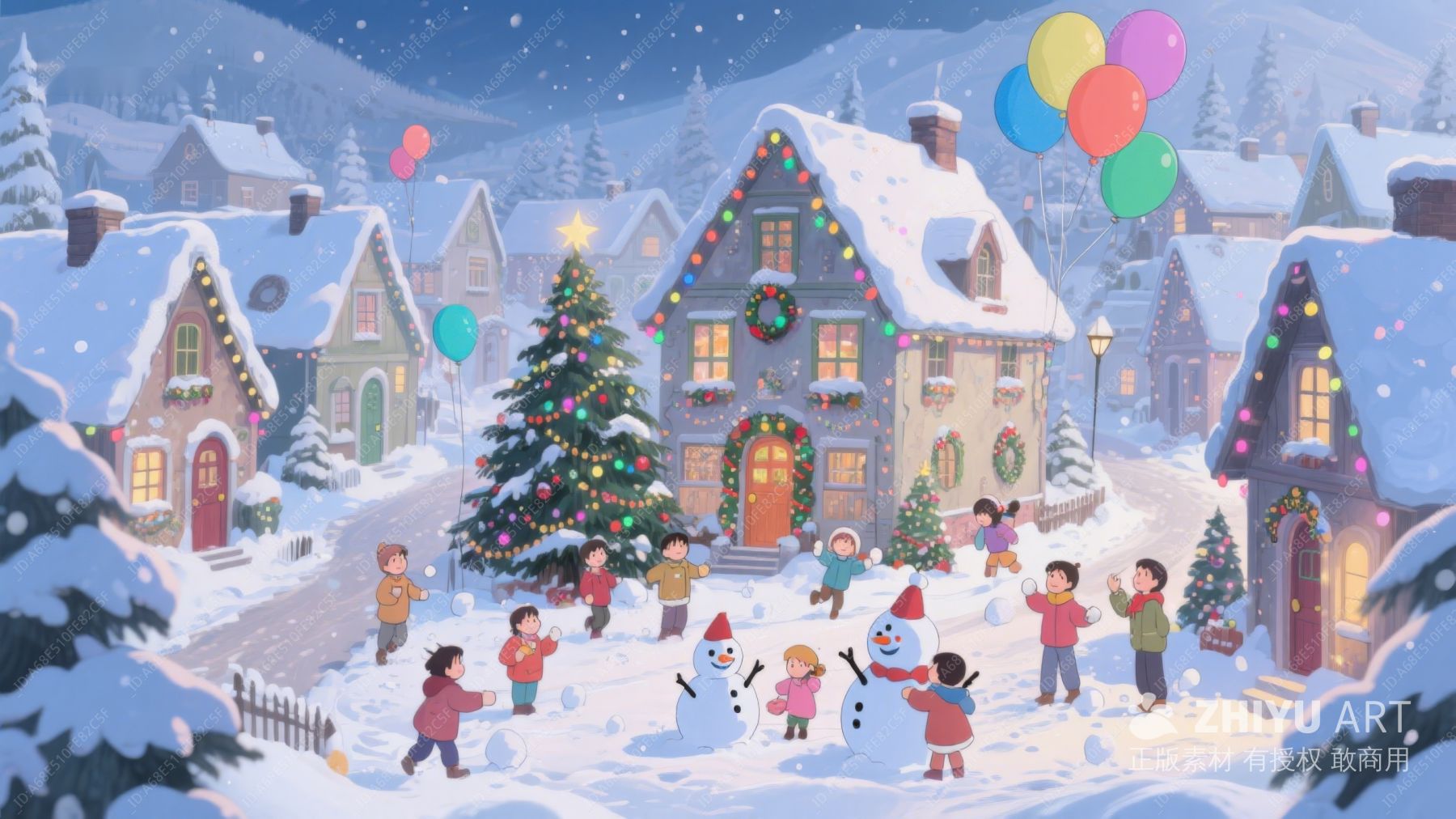 雪夜小镇的圣诞树与欢庆儿童 443