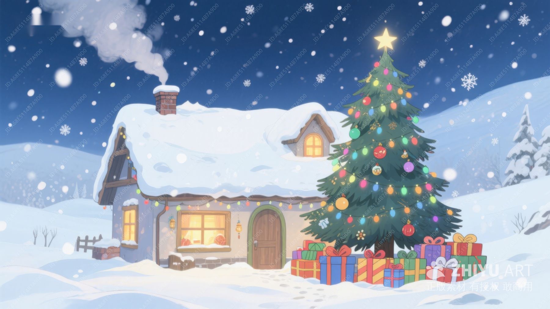 雪夜中的温馨小屋与圣诞树 488
