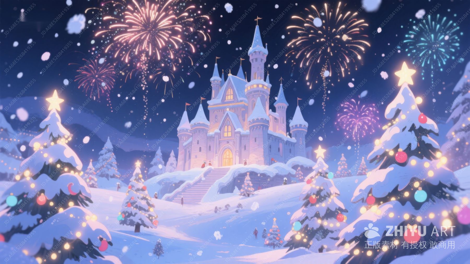 冬夜城堡烟花下的欢乐雪景 25