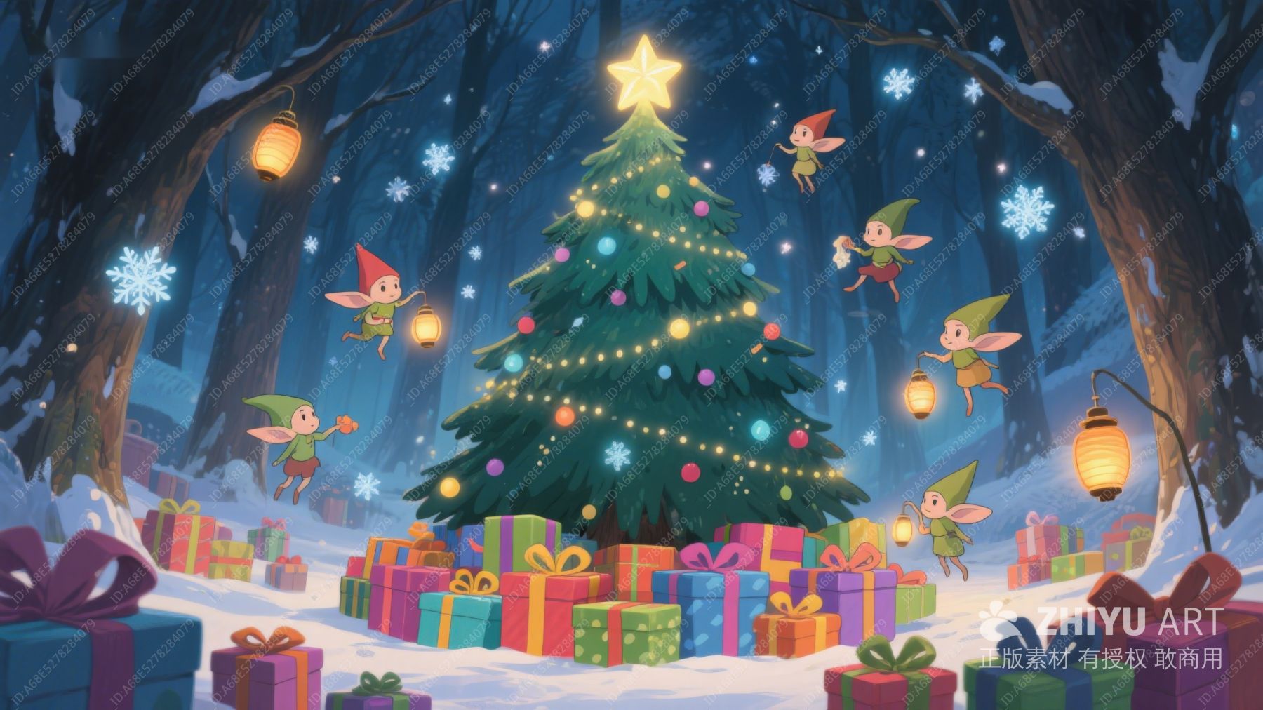 雪夜森林中的圣诞树与小精灵 397