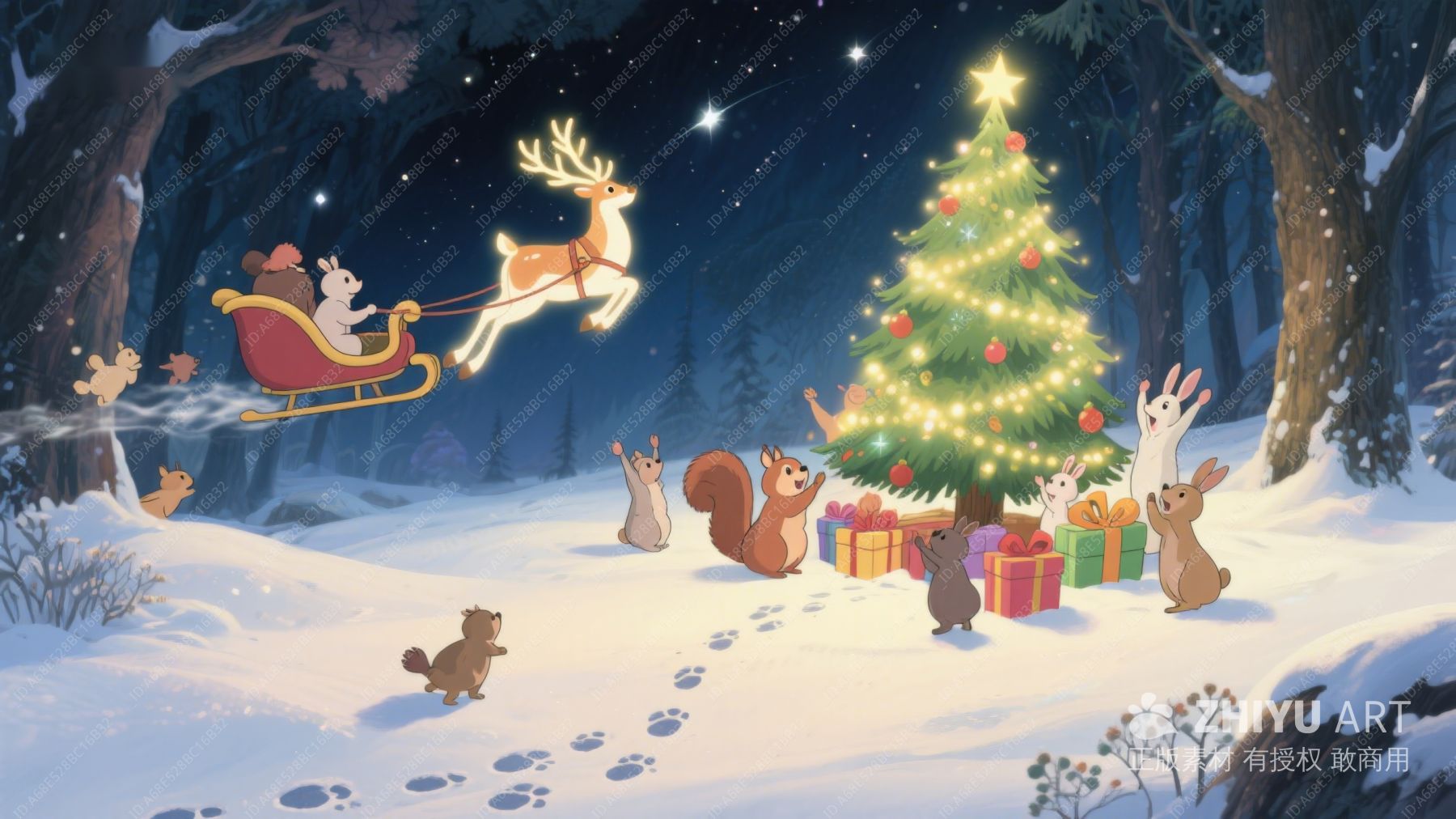 雪夜森林中的圣诞树与驯鹿雪橇 383