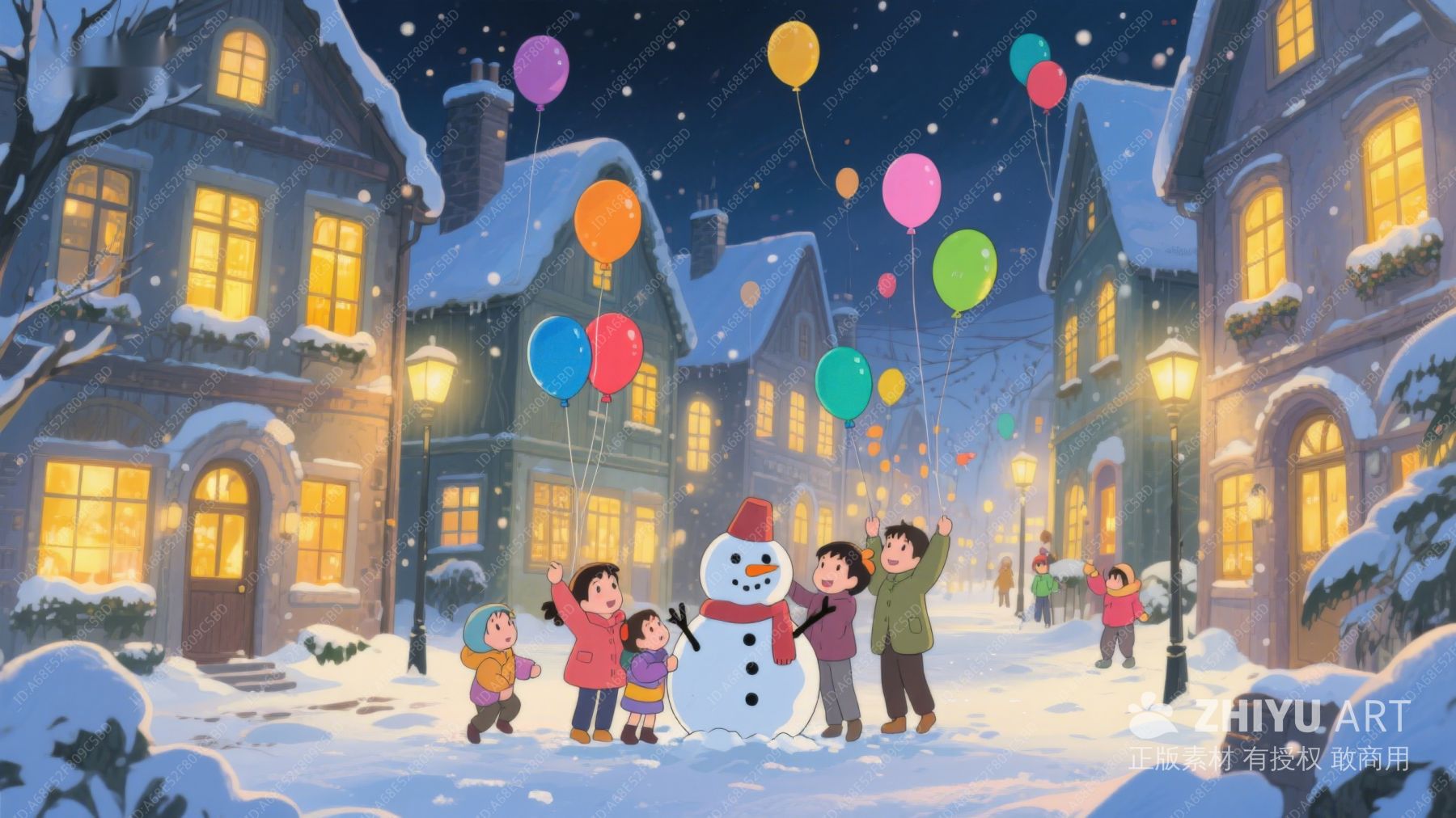 冬夜雪景中孩子们与雪人的欢乐时光 133