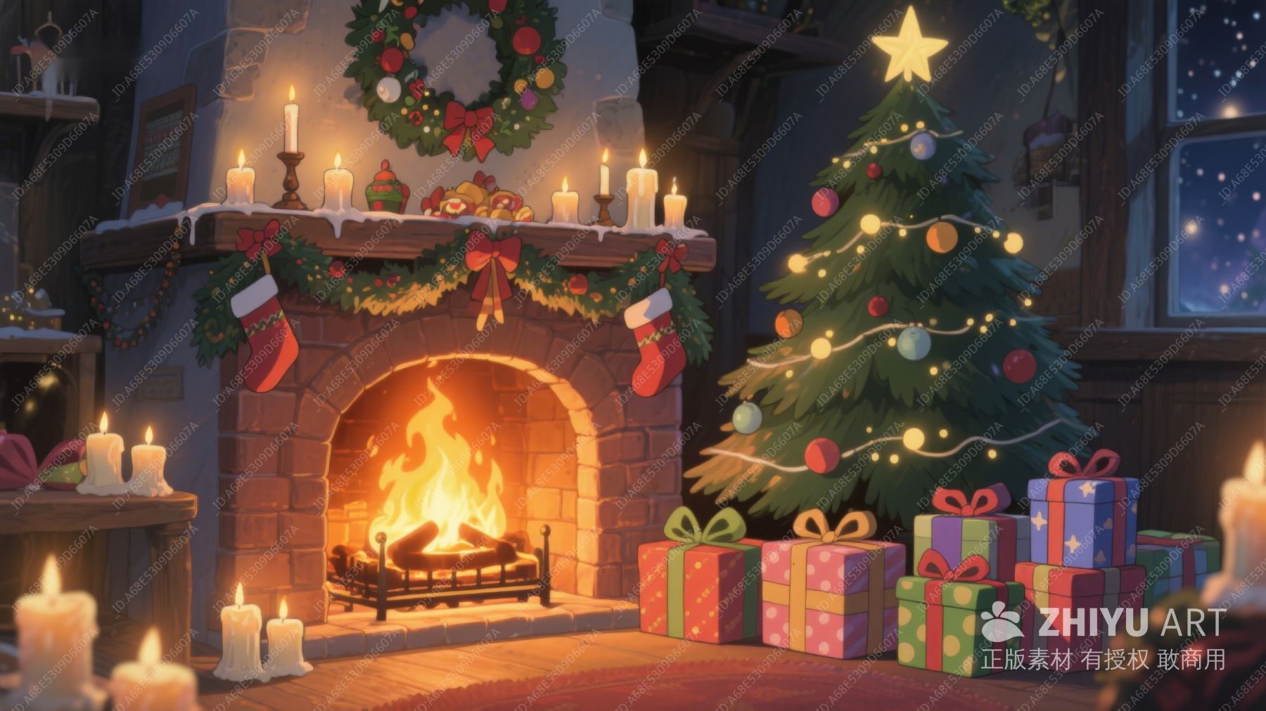 温馨圣诞夜,炉火旁的礼物与装饰 310