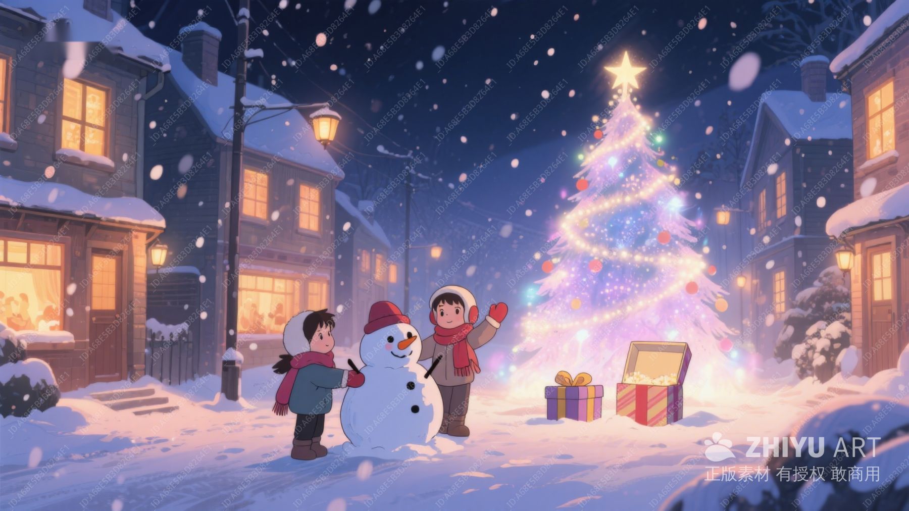 冬夜雪景中的圣诞树与孩子们 115