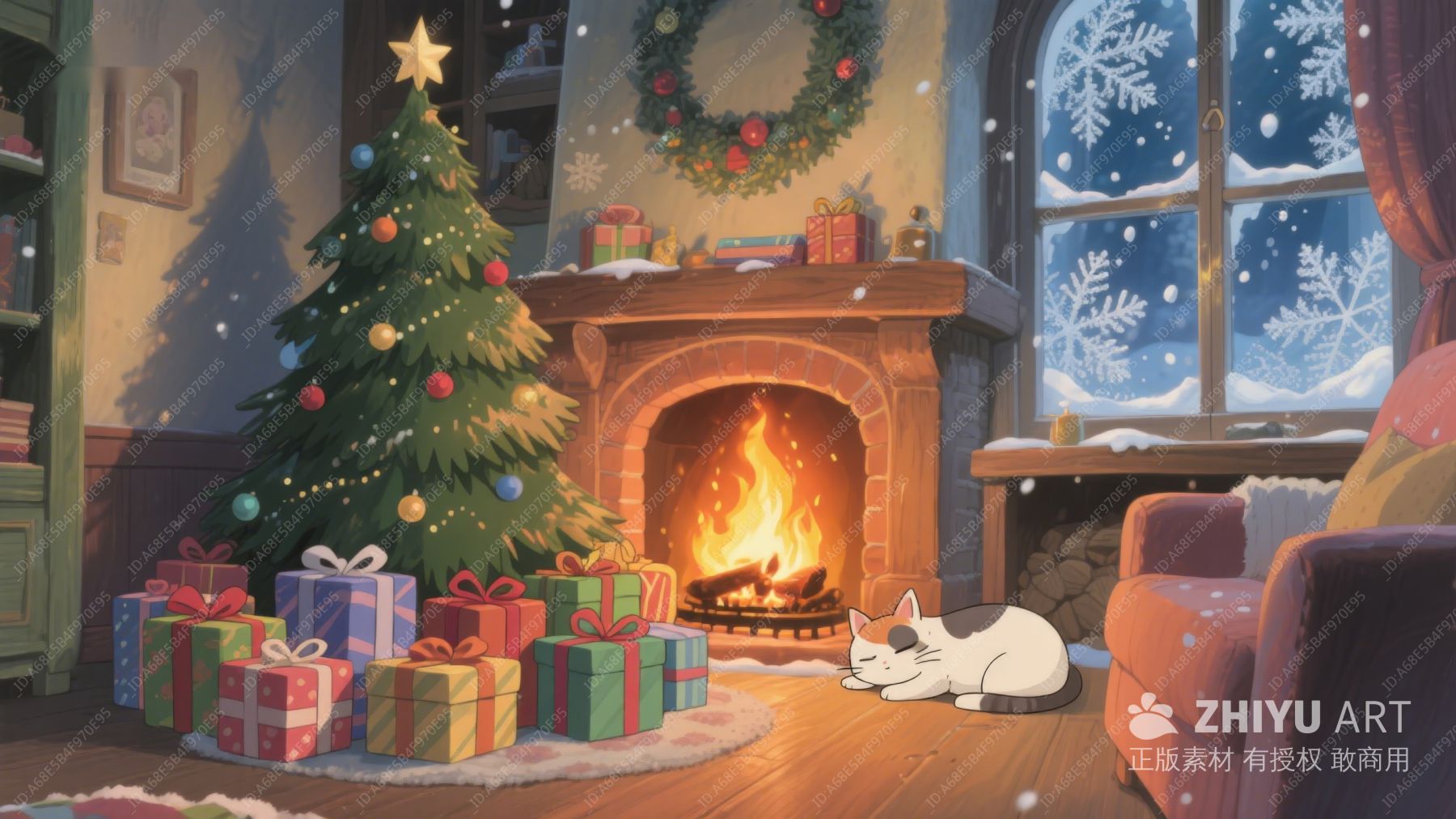 温馨圣诞夜,炉火旁的礼物与猫咪 306