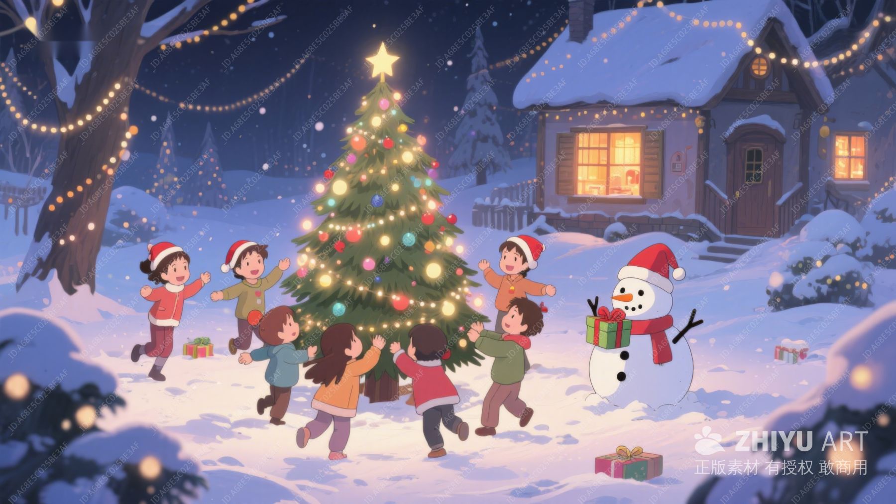 冬夜雪地里的圣诞树与欢乐儿童 100