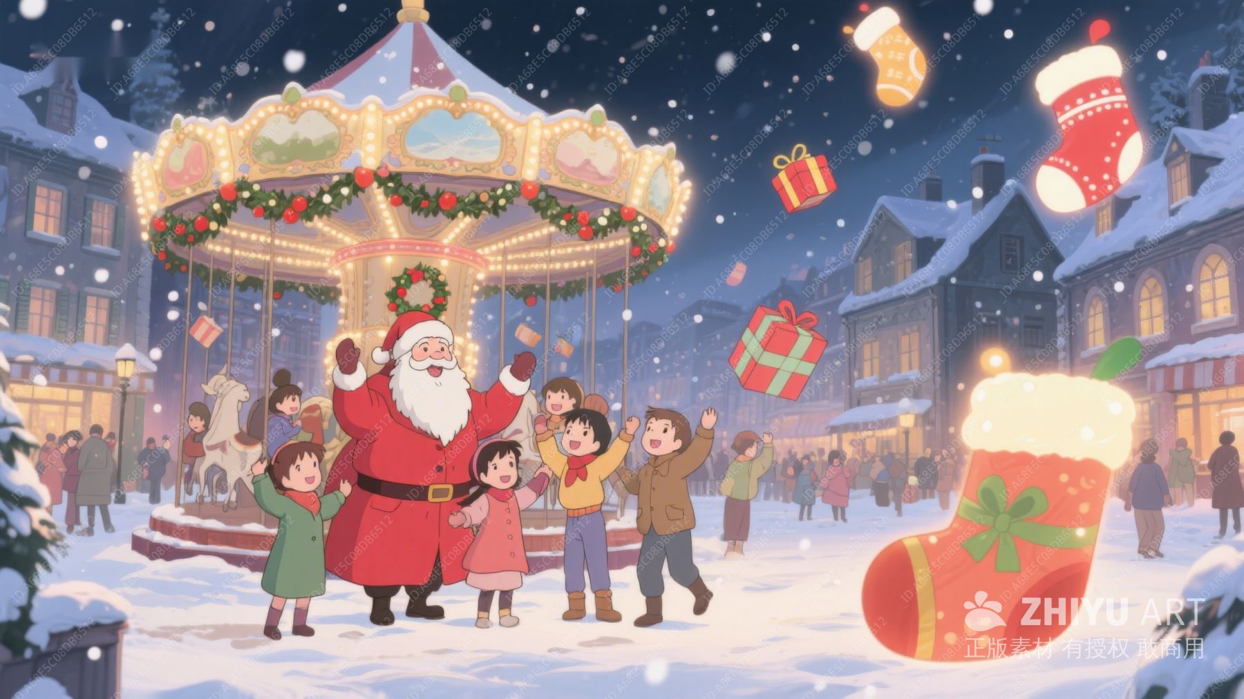 圣诞夜雪景:孩子们迎接飞越小镇的圣诞老人 208