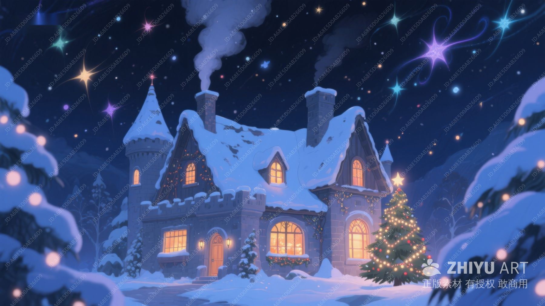 冬夜森林中的温馨小屋与彩灯圣诞树 60