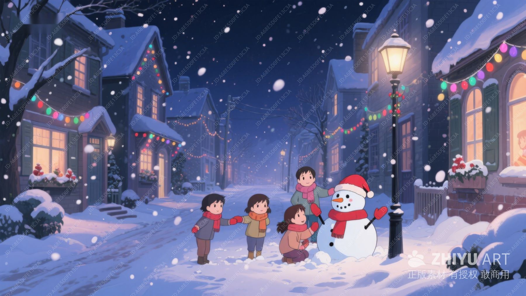 冬夜雪景中孩子们与雪人共度圣诞 129