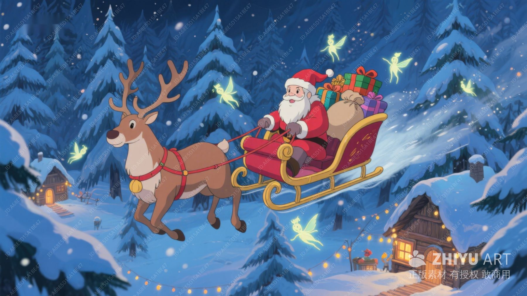 圣诞老人乘雪橇飞越雪夜村庄 177