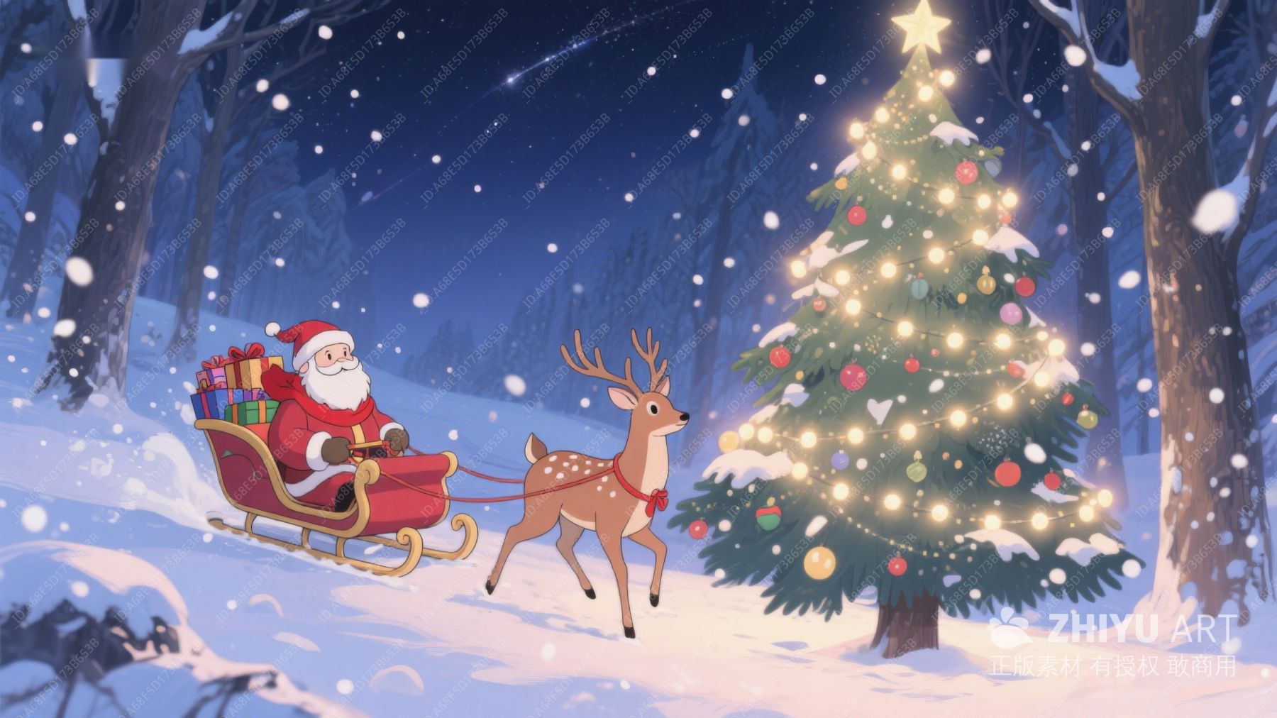 圣诞老人雪橇夜行,驯鹿相伴树旁 198