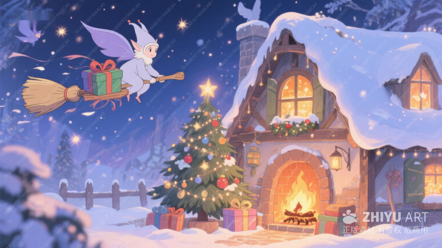 雪夜圣诞树旁的礼物与小精灵 410
