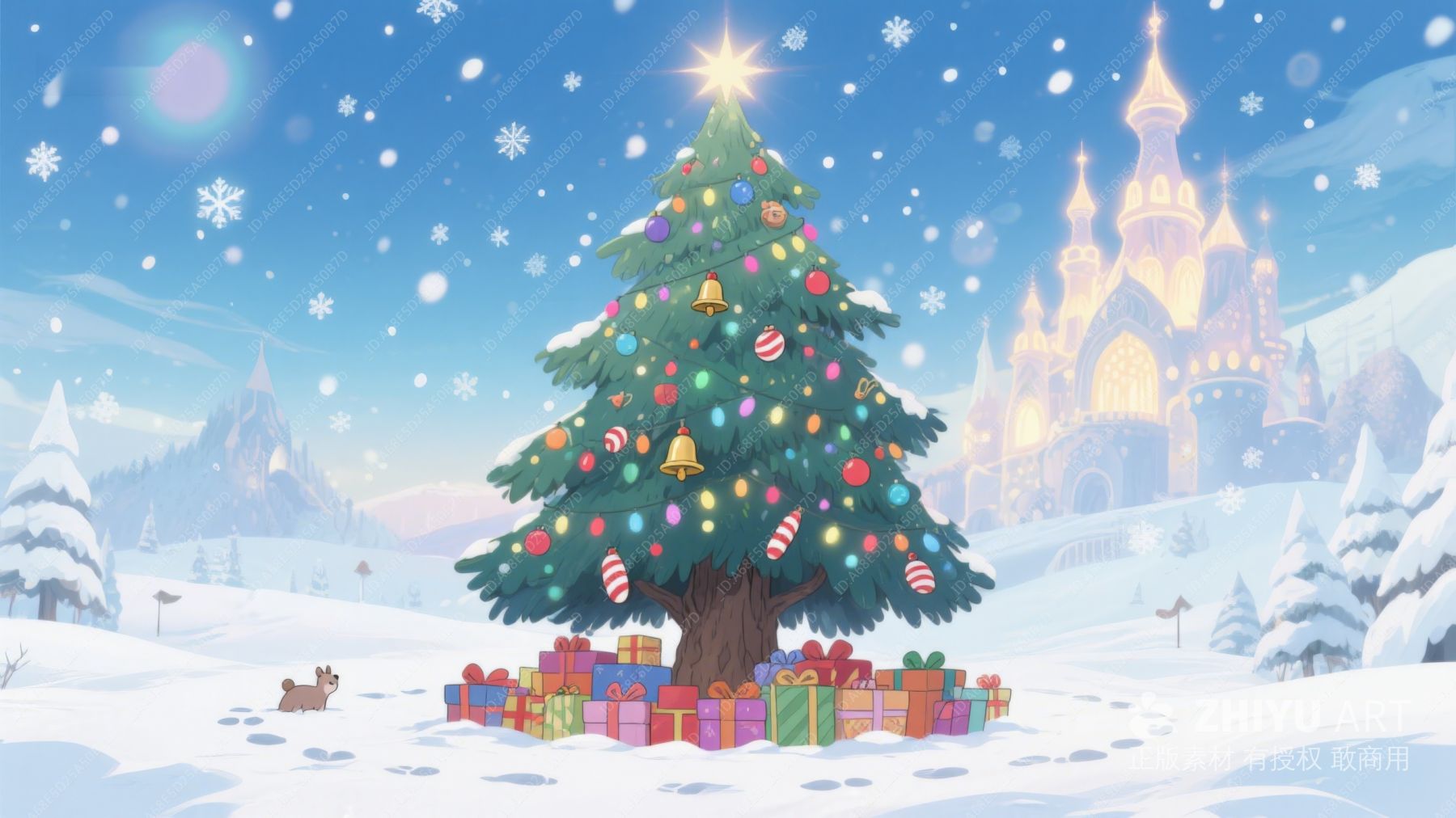 雪夜城堡前的圣诞树与欢庆儿童 350