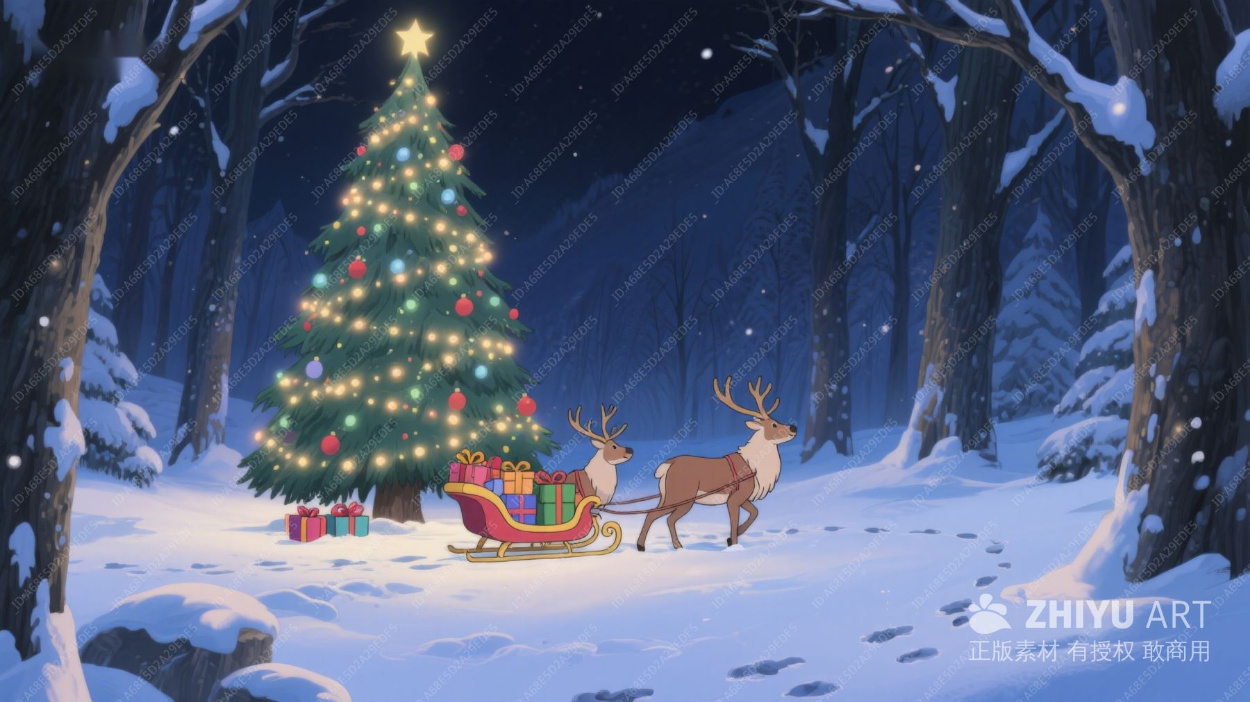 雪夜森林中的圣诞树与驯鹿雪橇 399