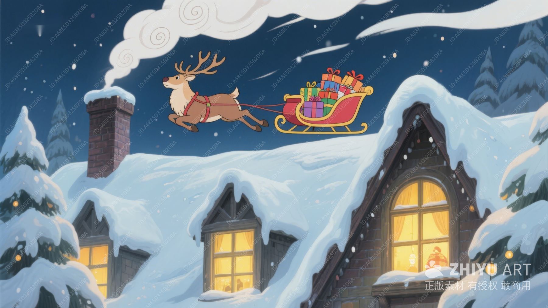 雪夜驯鹿拉着礼物飞过屋顶 475