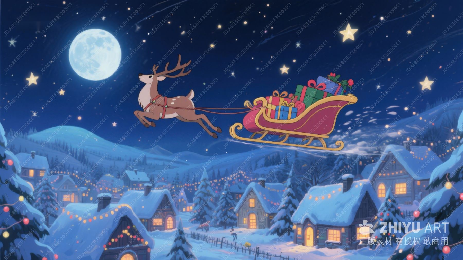 雪夜圣诞村,驯鹿拉着雪橇飞过 371
