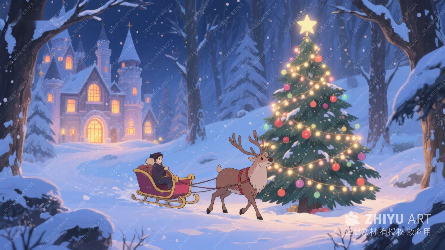 雪夜圣诞树与城堡 377