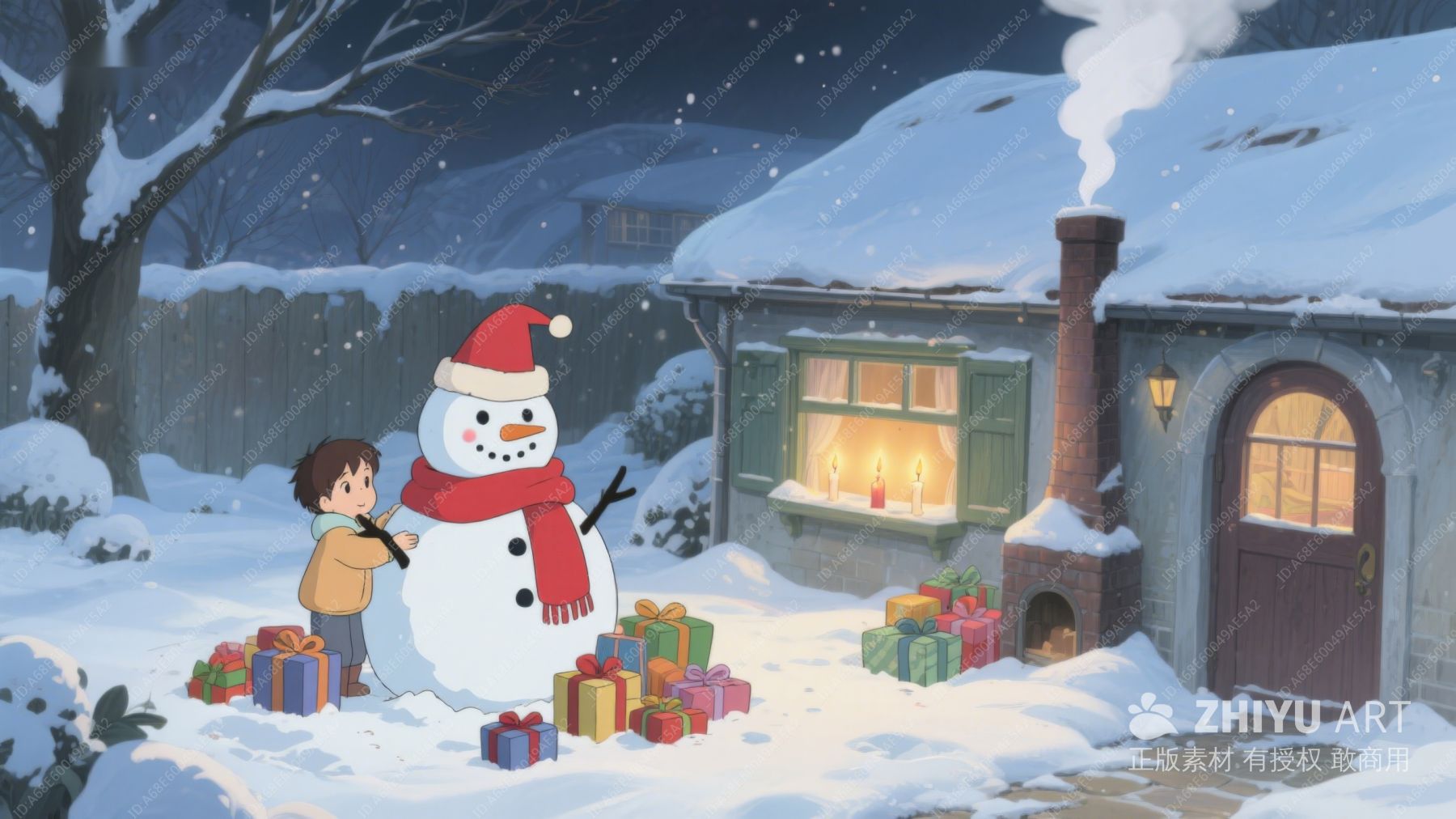 冬夜温馨场景:孩子们与雪人共度时光 71