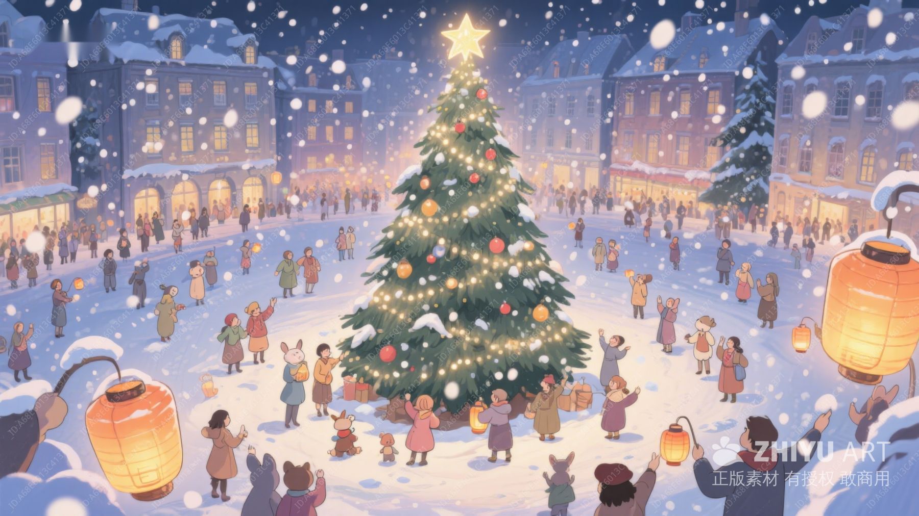雪夜广场上的圣诞树与欢庆人群 377