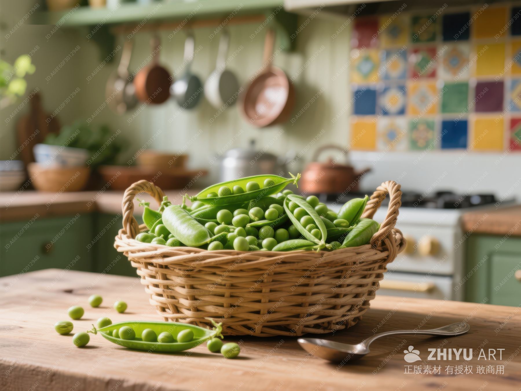 厨房桌上倾倒的篮子与新鲜豌豆 143