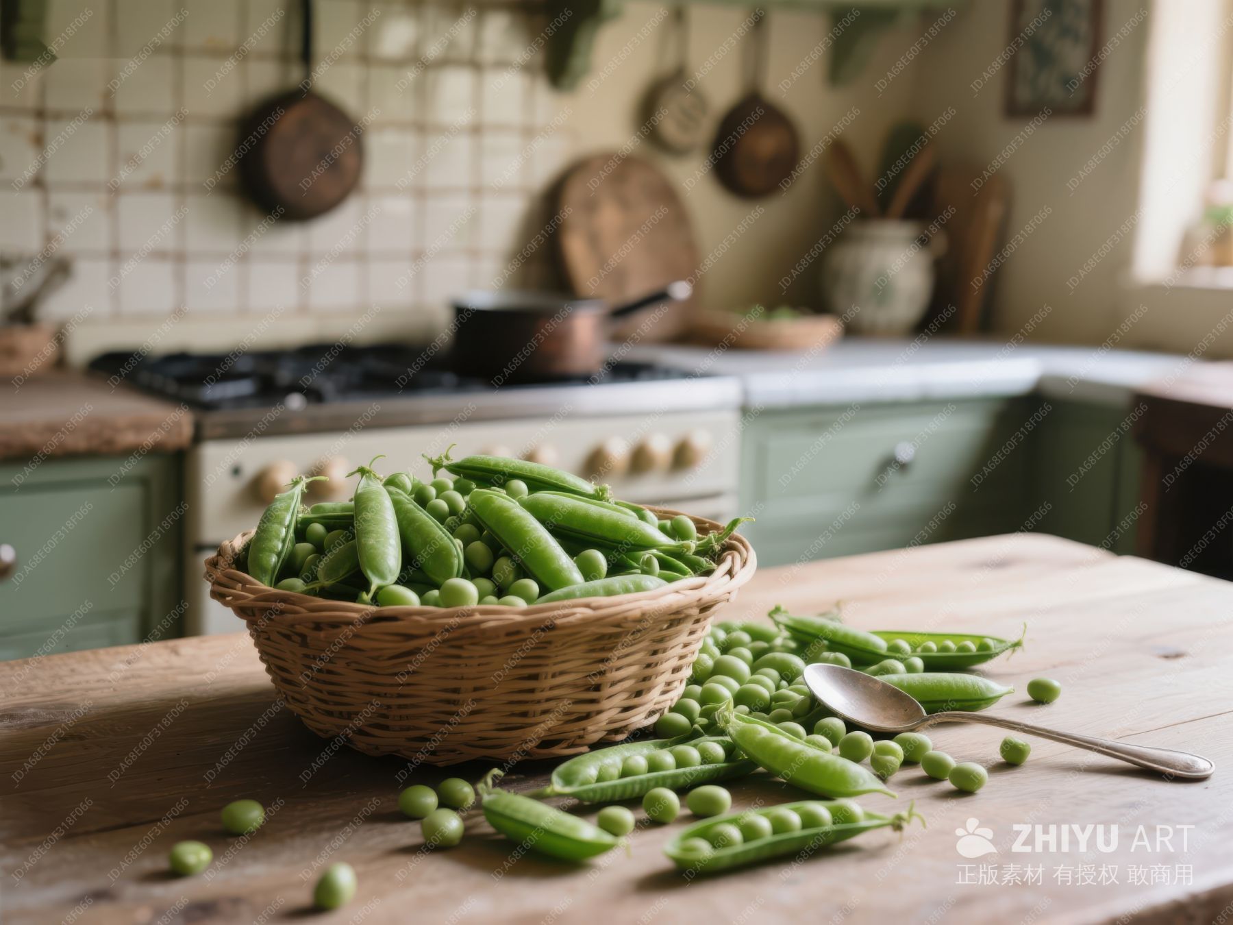厨房桌上倾倒的篮子与新鲜豌豆 143