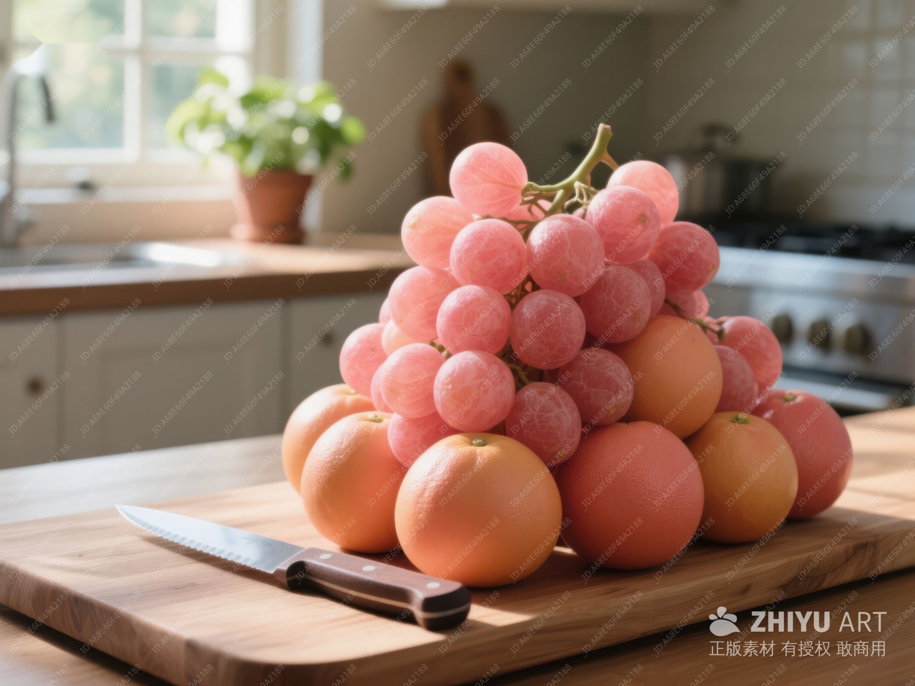 厨房台面上的粉色葡萄与柚子 94