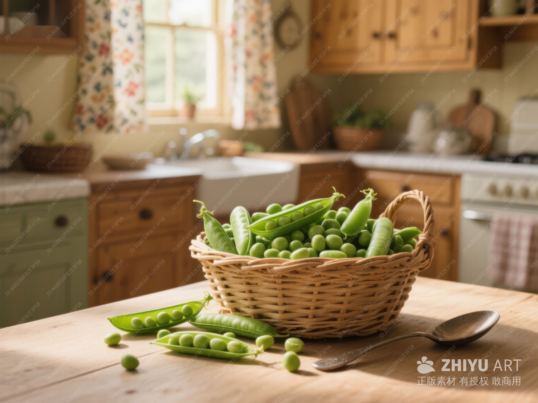 厨房桌上篮装新鲜豌豆 142