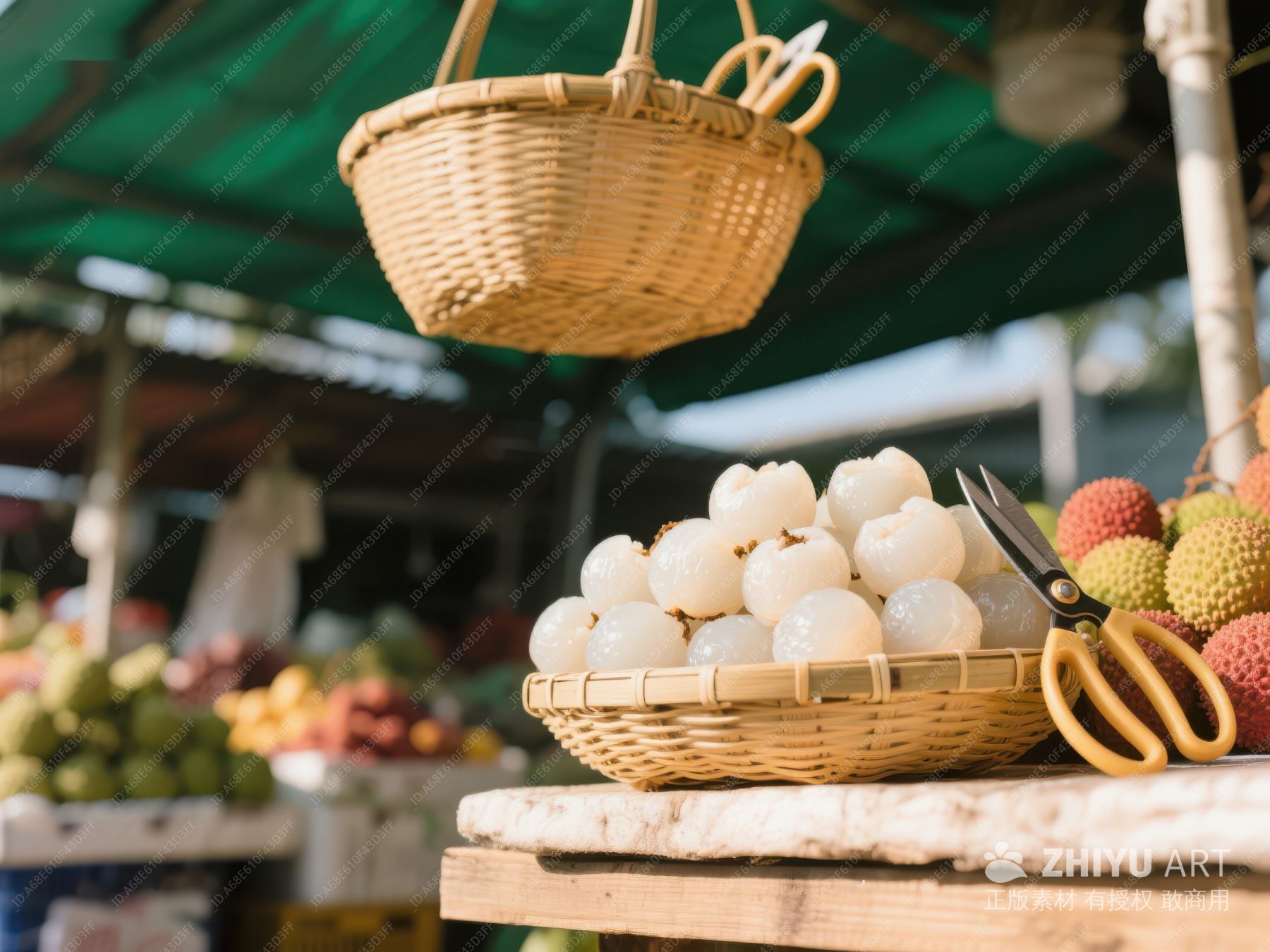 新鲜荔枝摆放在竹篮中,背景为水果市场 505