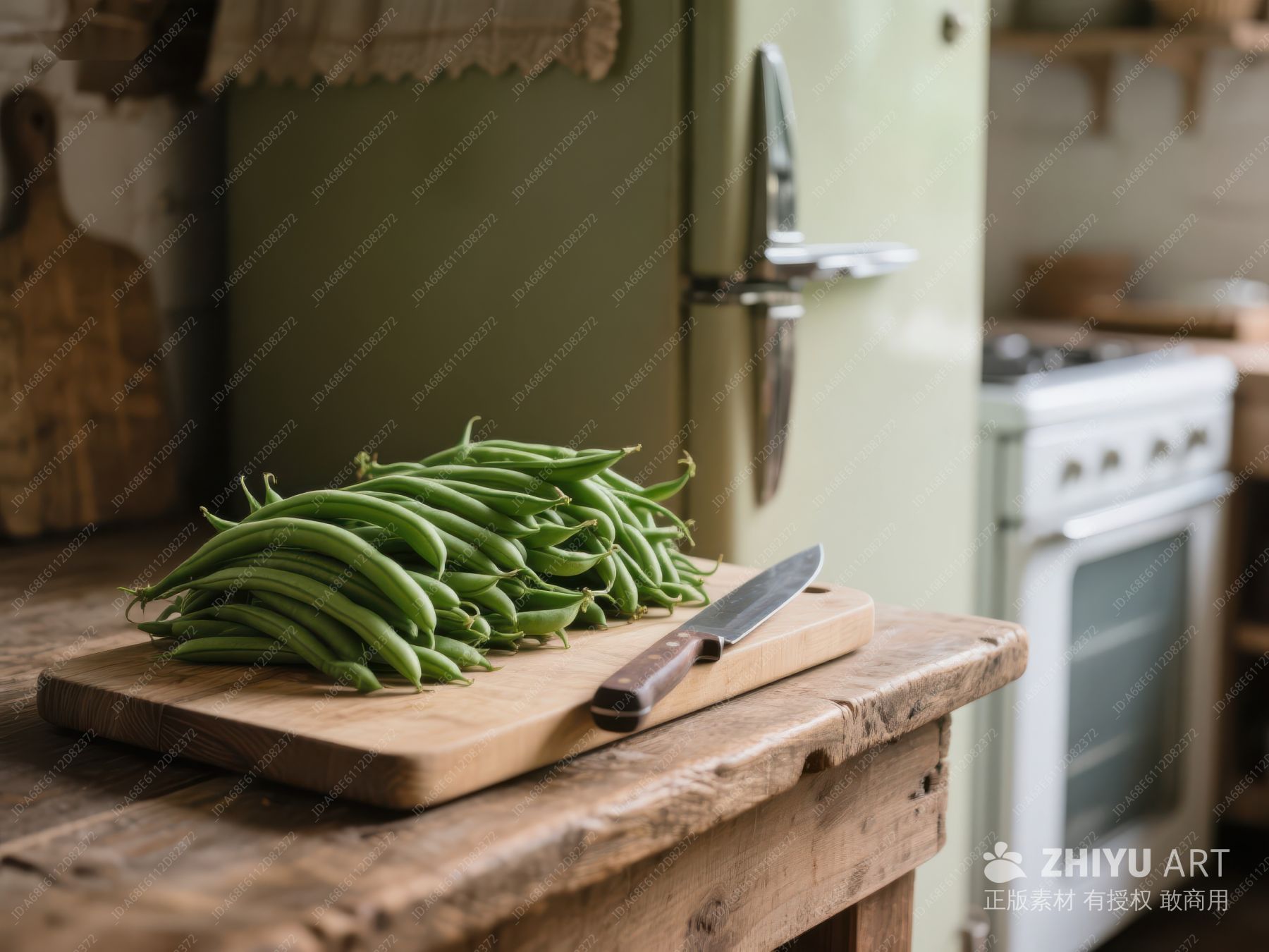 新鲜绿色豆角整齐排列于玻璃桌面 471