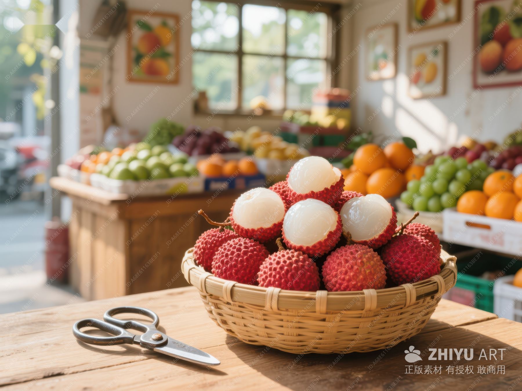 新鲜荔枝摆放在竹篮中,背景为水果市场 505