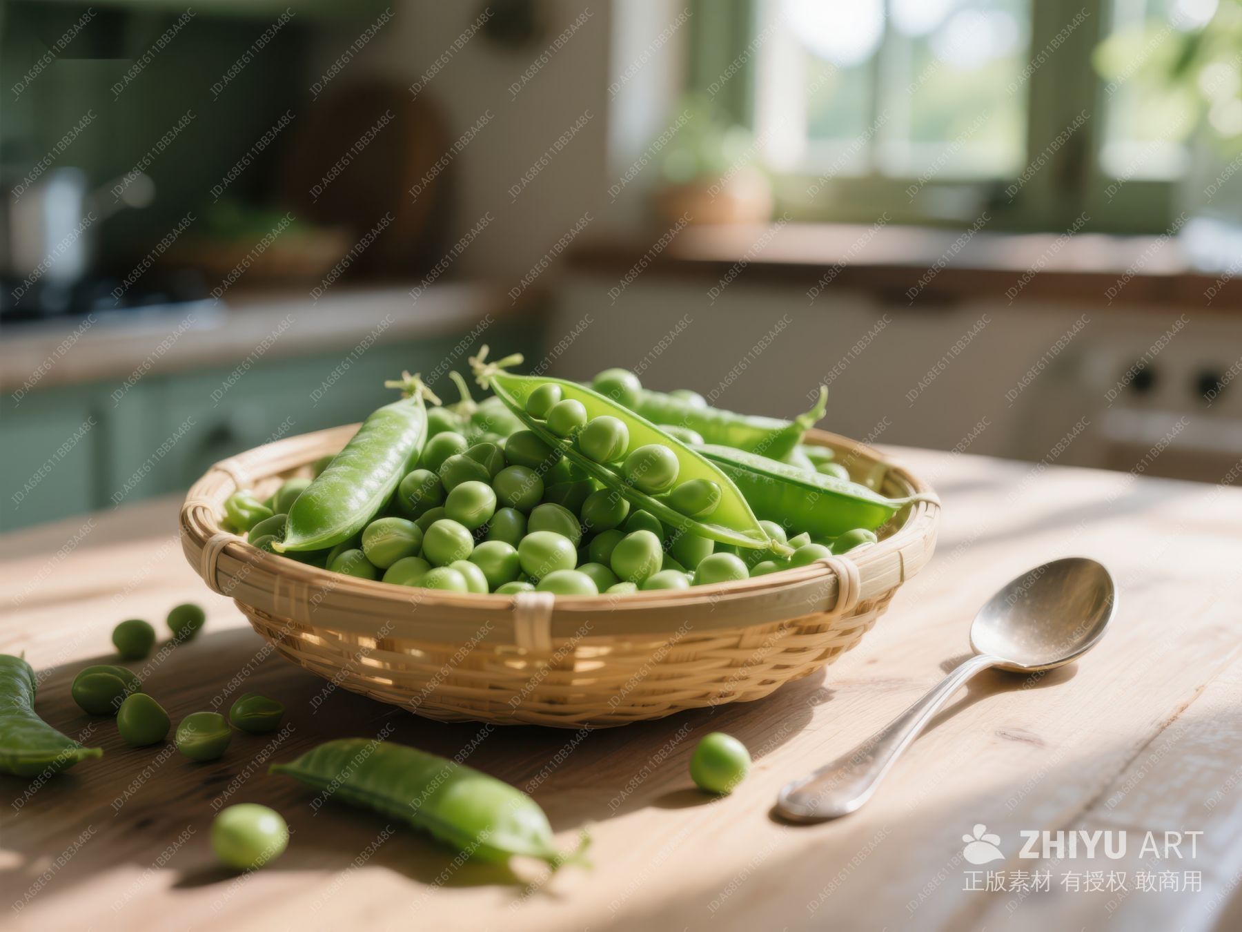 新鲜豌豆置于竹篮,窗边自然光照射 536