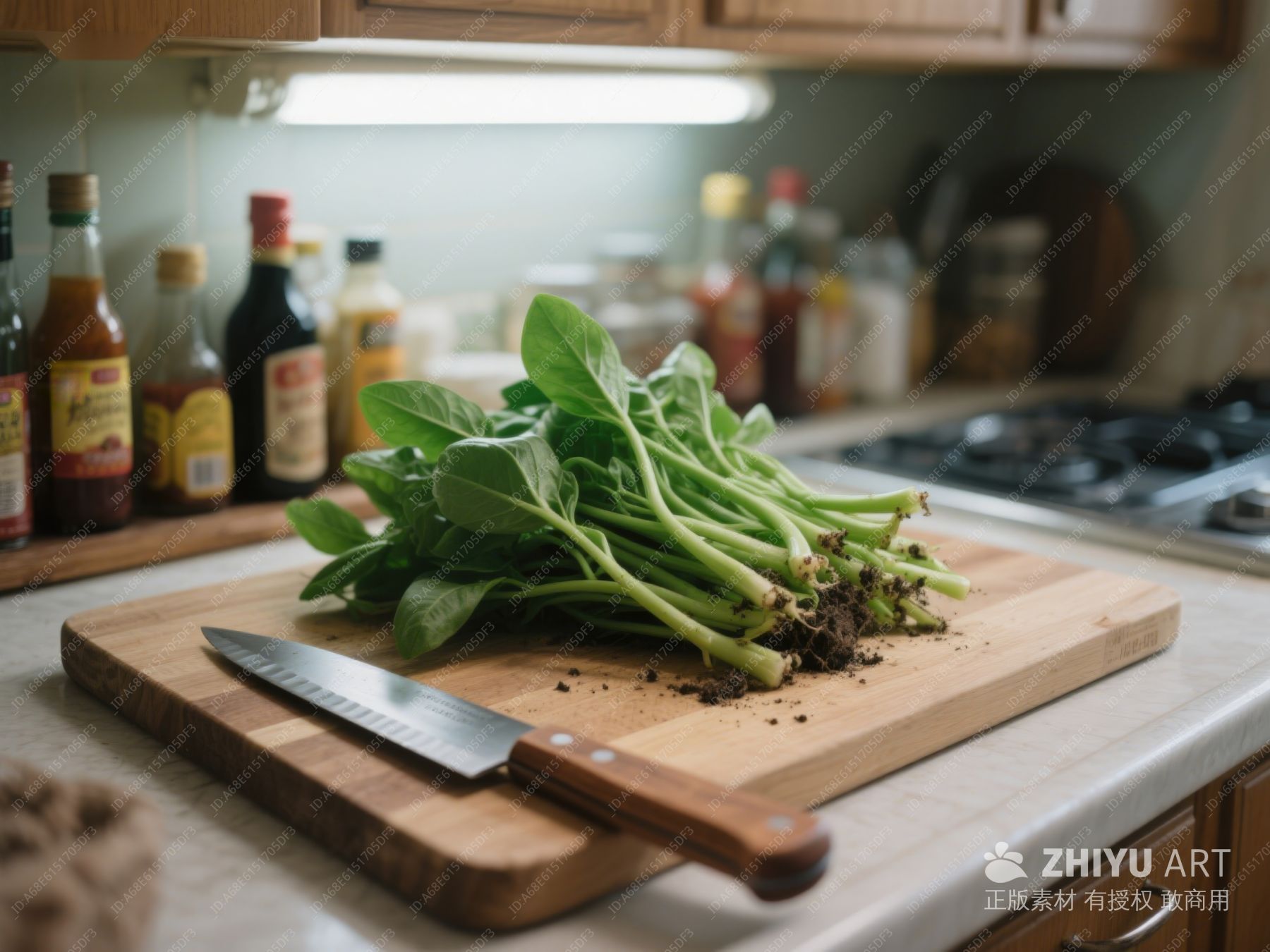 新鲜绿叶蔬菜与菜刀置于砧板上 459