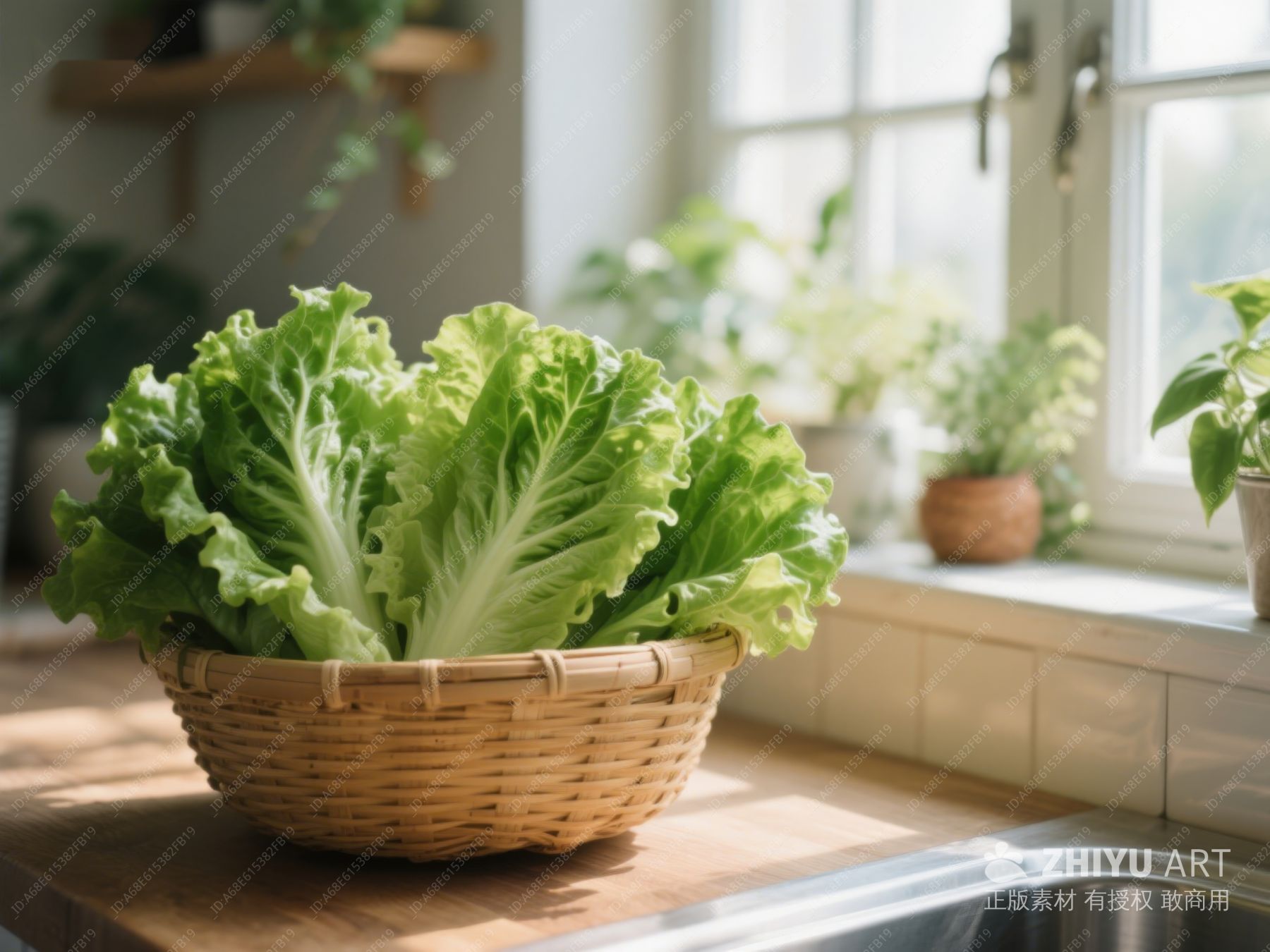 新鲜生菜置于竹篮中,厨房窗边 526