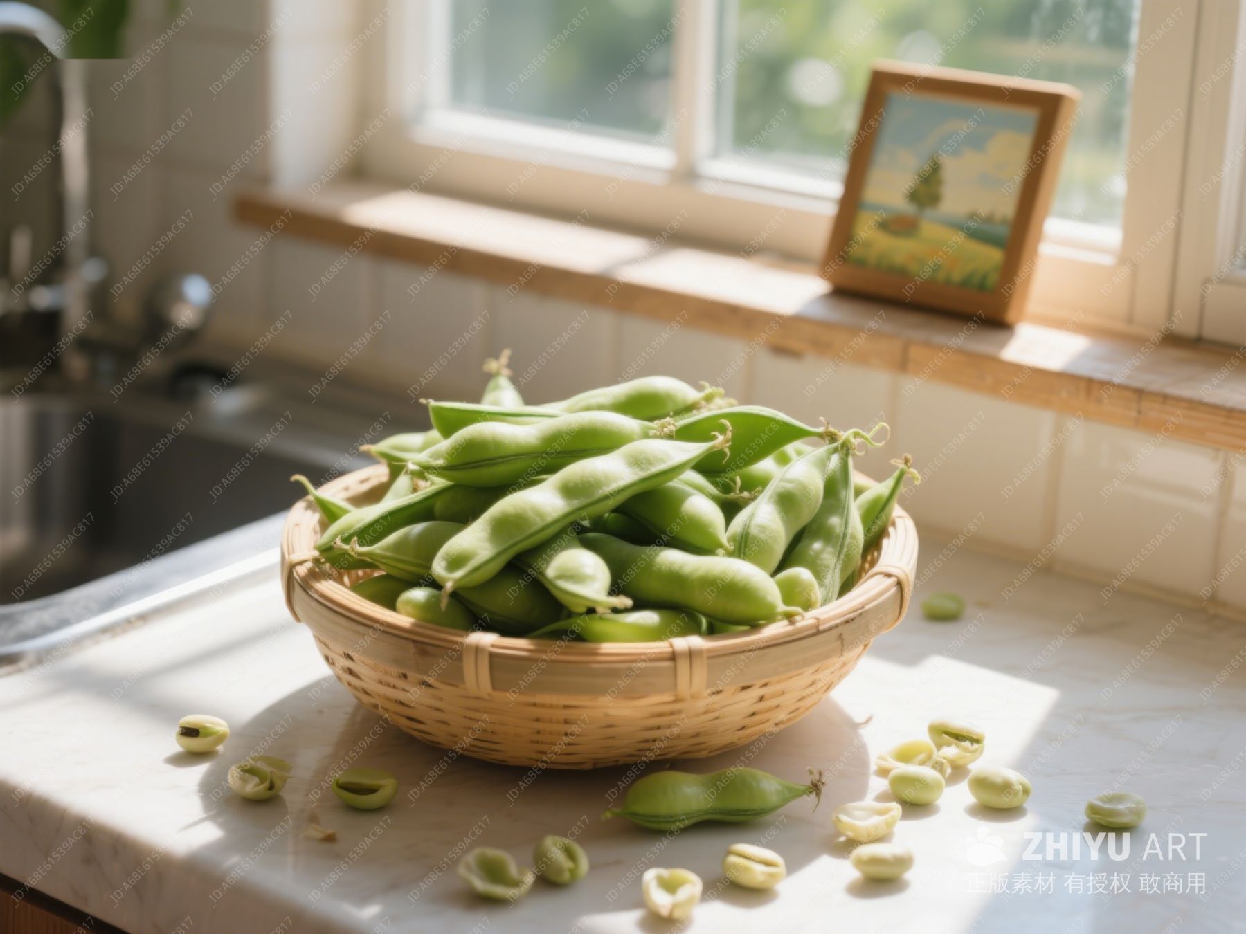 新鲜蚕豆置于竹篮中,窗边阳光洒落 408