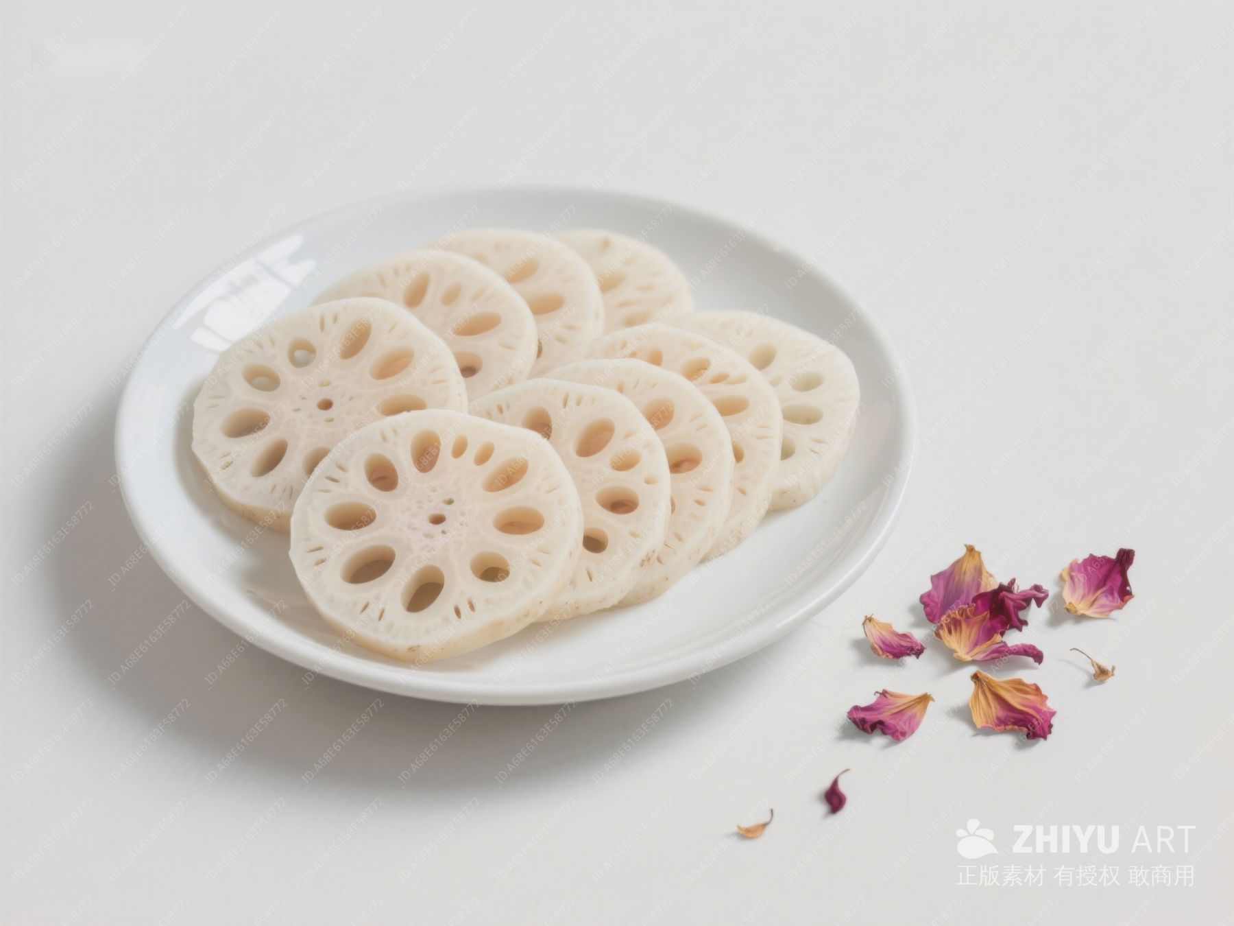 莲藕切片置于白盘,旁有花瓣点缀 249