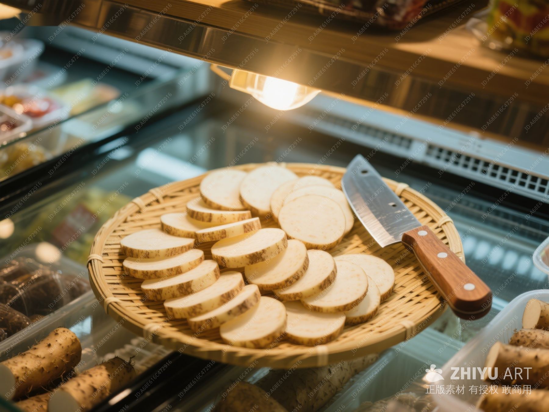 切片山药置于竹篮,木桌旁配刀具 331